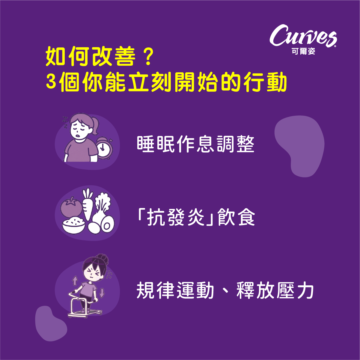 →最簡單的方法:每週3次Curves可爾姿女性30分鐘運動—「肌力+有氧+伸展訓練」一次搞定省時、高效又安全。