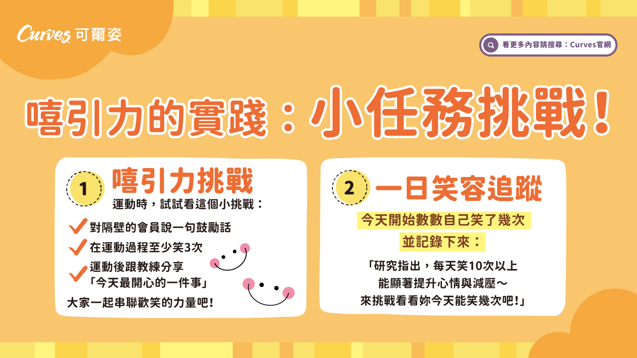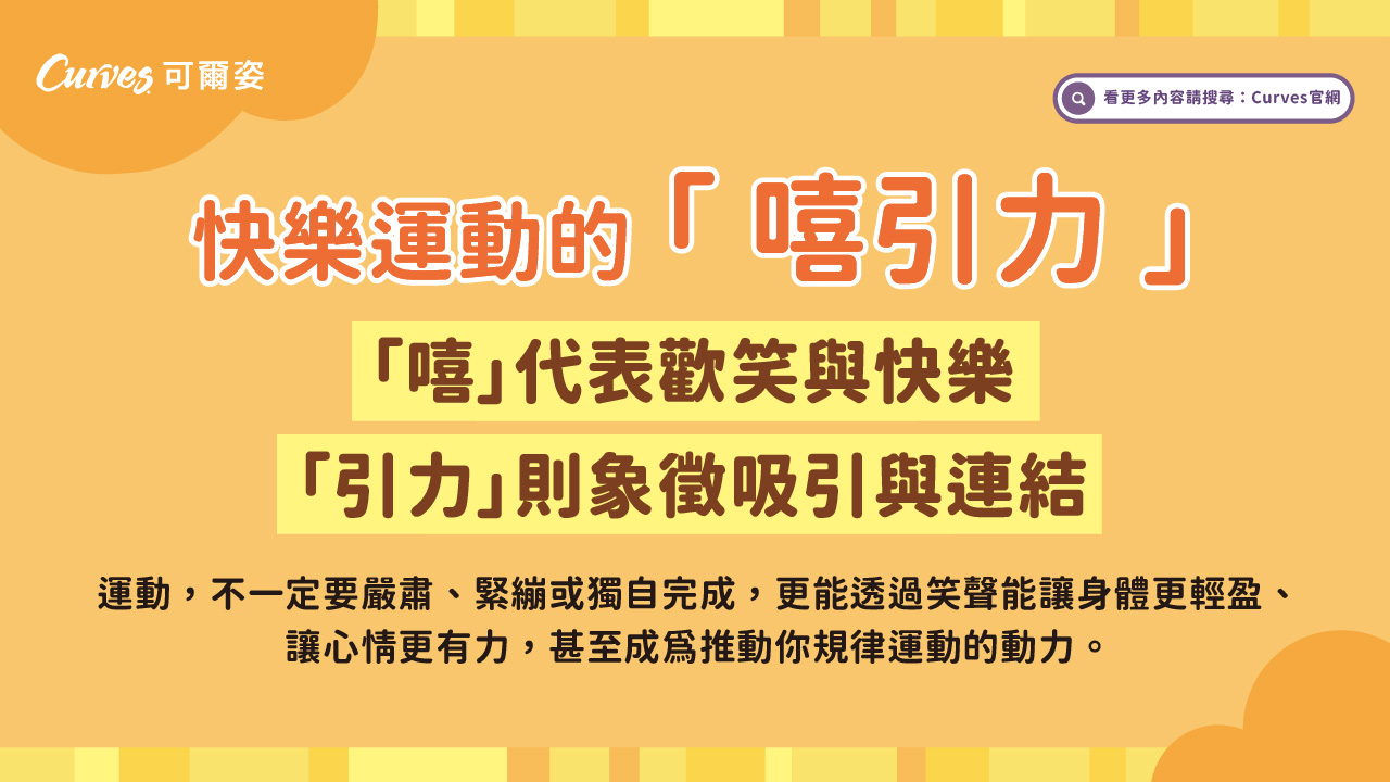 在Curves可爾姿,不只是為了燃燒卡路里或改變外型,更能透過笑聲讓身體更輕盈、讓心情更有力,甚至成為推動你規律運動的動力—「嘻引力」。