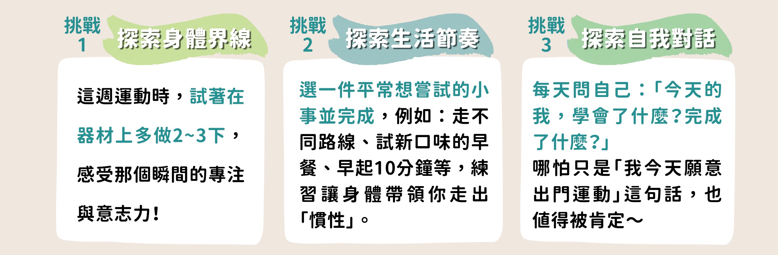 運動讓我們學會傾聽自己的節奏:今天的我需要喘口氣?還是可以再多做幾下?這些小小的覺察,其實就是一種「自我探索」。當你懂得照顧身體,也會更懂得照顧心!