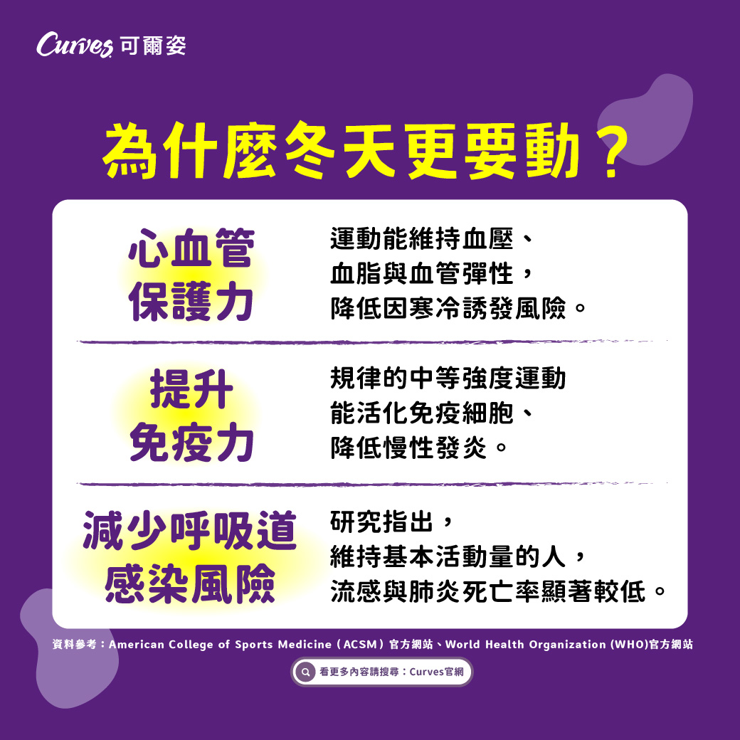 寒冷的天氣常讓人想賴在被窩,但其實冬天更需要穩定運動!不只是為了體重或好看,更能實際預防呼吸道與心血管等與寒冷相關的疾病。