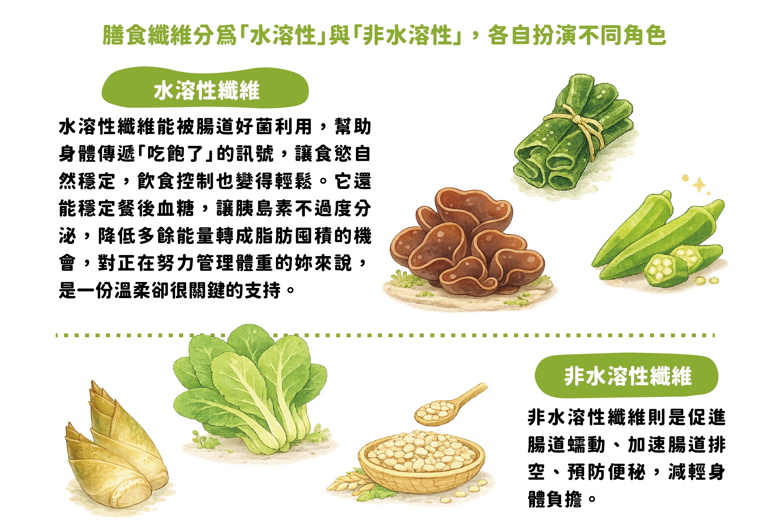 除此之外,膳食纖維分為水溶性與非水溶性兩大類,兩者功能不同,建議多樣化攝取不同蔬果,才能兩者都吃到喔。